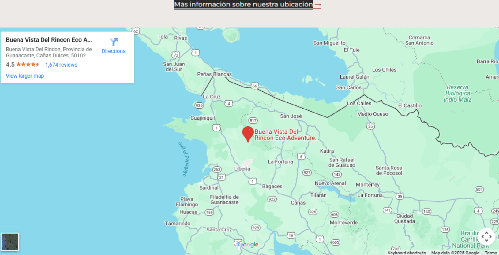 Llegar a Buena Vista del Rincón desde el Aeropuerto de Liberia es fácil, rápido y escénico. En aproximadamente 1 hora podés viajar en shuttle, alquiler de auto o transporte privado, mientras disfrutas del paisaje rural y volcánico del bosque guanacasteco. Una experiencia sencilla… ¡que inicia tu aventura en la montaña!